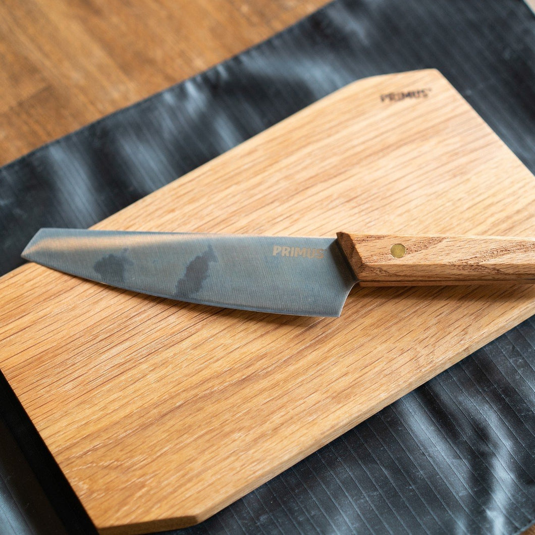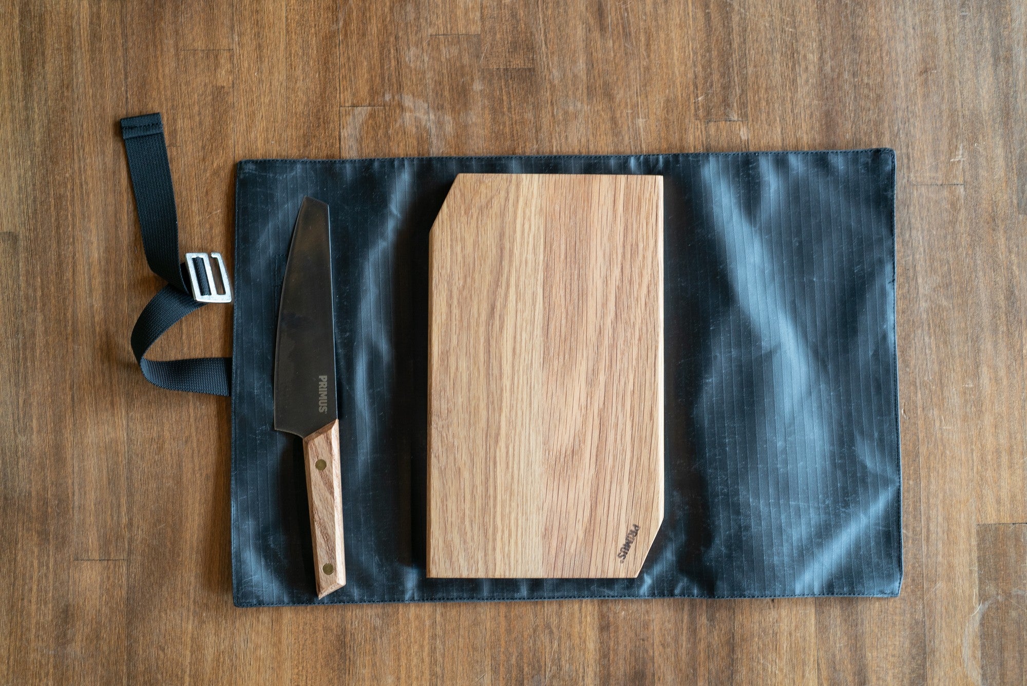 料理用ナイフとカッティングボードのセット。手にとった瞬間に感触から伝わる上質感。程よく重厚感のあるカッティングボードと、日本の三徳包丁タイプのナイフ。ロールケースには磁石がついていて包丁がずり落ちるのを防いでくれています。